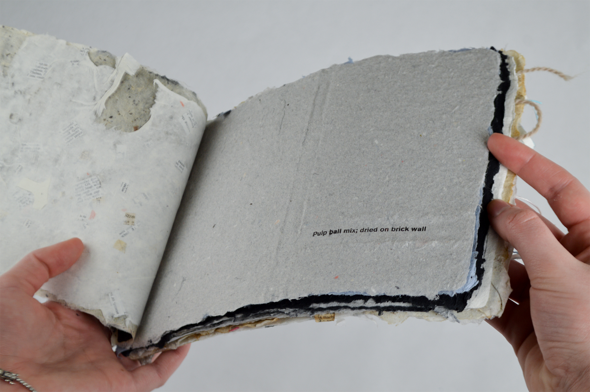 - Abaca + formation aid; bookbinding thread; shredded photographs; Neenah paper scraps; printed book scraps